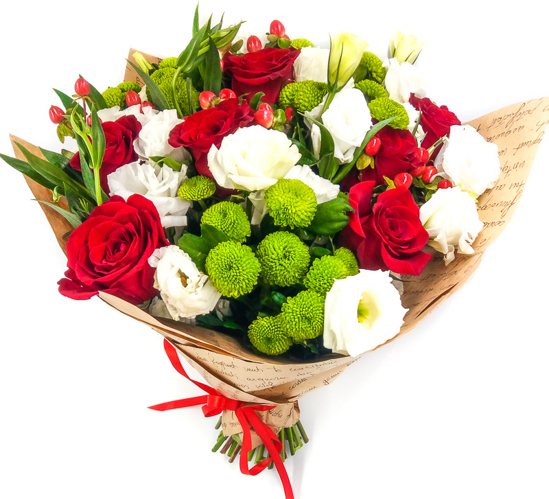 Прекрасный букет из удивительной и загадочной белой эустомы и шикарных благоухающих красных роз, в обрамлении зеленой хризантемы - это букет, символизирующий молодость и непорочность, настоящую красоту, радость и любовь. Такой букет является замечательным дополнением любого праздника, романтического свидания и свадебного торжества.